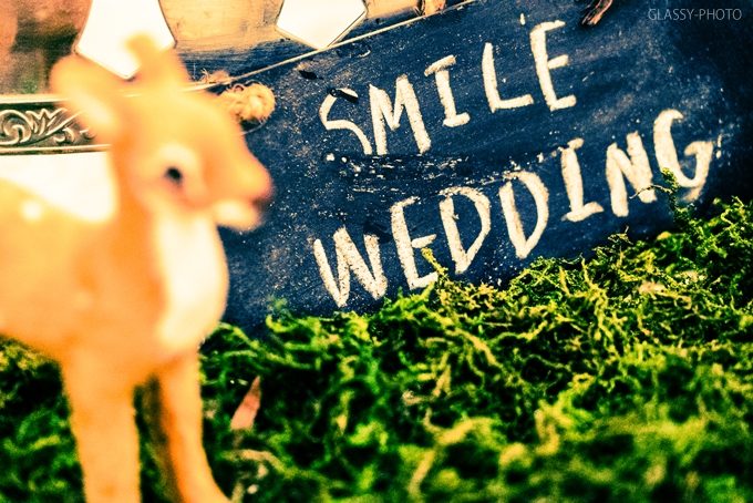 ウェディングボードの「SMILE WEDDING」と木彫りのウェルカムラビット