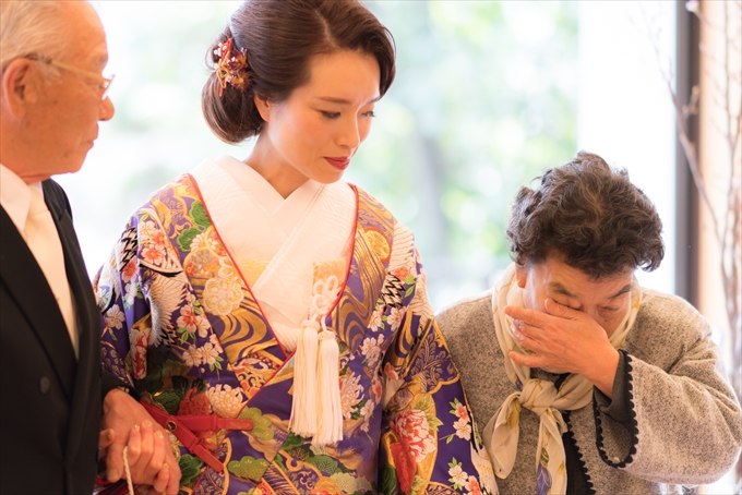 花嫁さんはご中座のエスコートにじいちゃんばあちゃんを選ばれました。じいちゃんは「自慢の孫じゃ!」と、ばあちゃんは感激の涙で言葉が出ません。カメラマンもなんだか嬉しくなっちゃうのです。