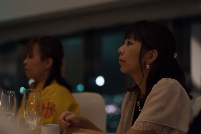 さすがは28階からの名古屋の夜景ですね。目視ではもう少し暗いのですが、こちらの写真ではシャッター速度を遅くして明るめに写してみました。空の感じを見ると目視より明るくしているのが分かりやすいですね。上部左右は会場内の明かりが窓に写り込んでいるものです。これ台風が到着する直前なんですよ。天気予報ではものすごく強烈な台風とのことでしたね。